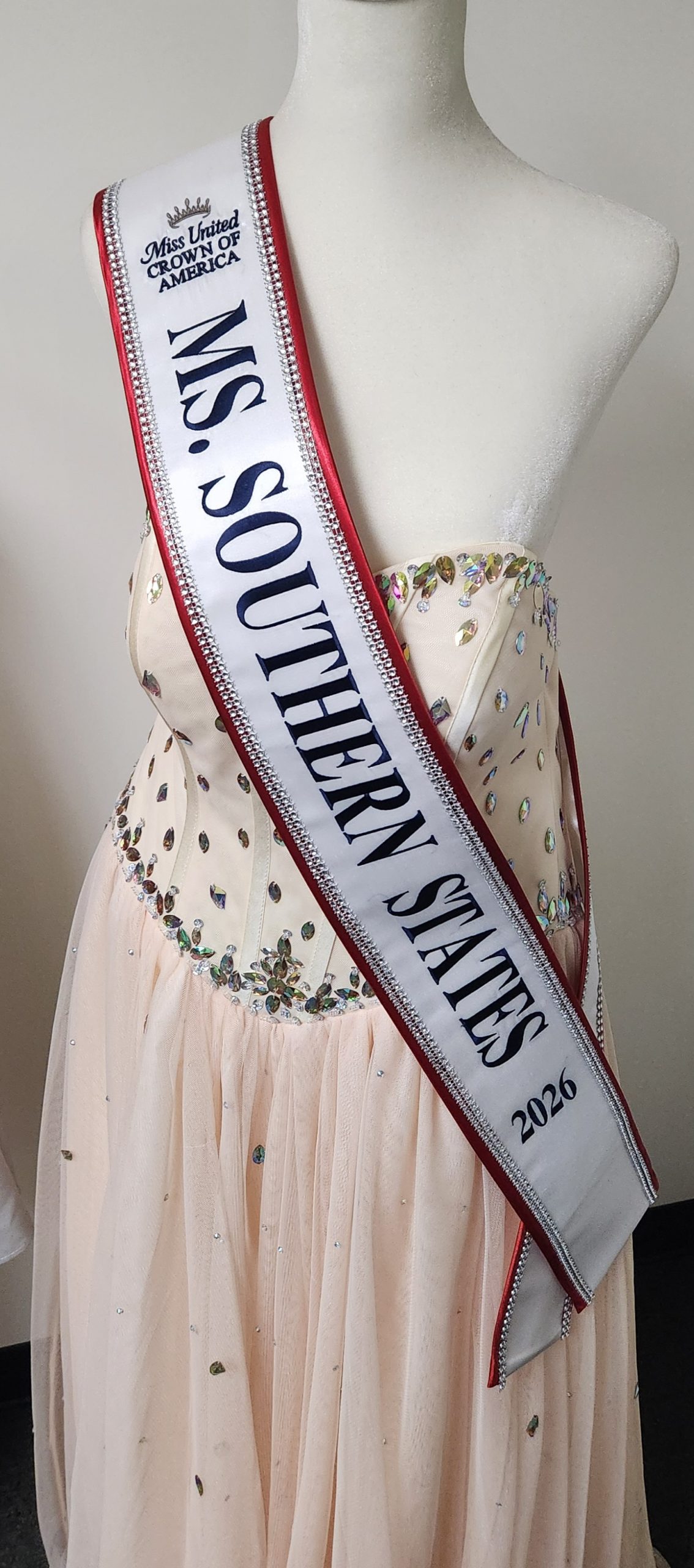 UCA Limelight Pageant Sashes come with the UCA crown and logo on the shoulder. Sashes will be white with red border and Navy Blue embroidery. We think adding Silver Bing Dots around the border will add that extra flare putting you in the limelight!